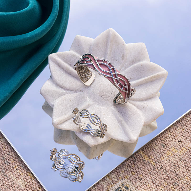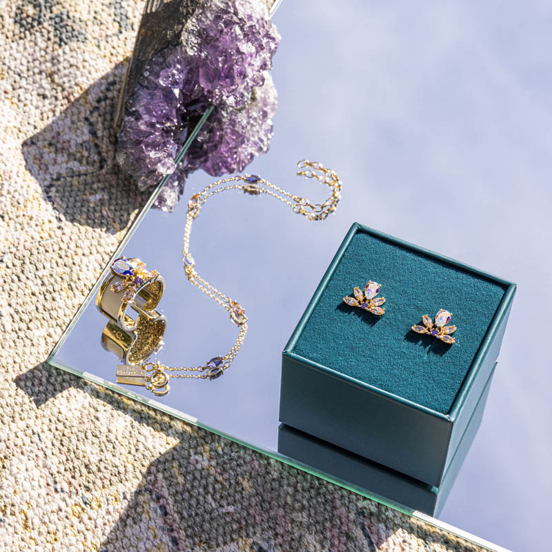 En cette saison où les jours se rallongent, les énergies positives nous entourent. L'été s'annonce avec de toutes nouvelles parures ! Des cristaux colorés habillent les créations de notre parure CRISTAL. La ligne ROSACE offre un subtil mélange de matières avec des pierres naturelles et de l'émail sur le bijou, auquel il est possible d'ajouter un cuir. À porter pour les grandes occasions !